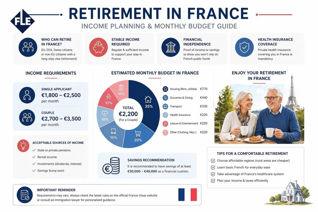 For many applicants, the most important question is the france retirement visa income requirement. French authorities generally want to see that retirees can live in France without working locally or relying on public support. There is no single “retirement” threshold published for every case, but consulates commonly assess whether your resources appear stable, regular, and sufficient for the intended stay.